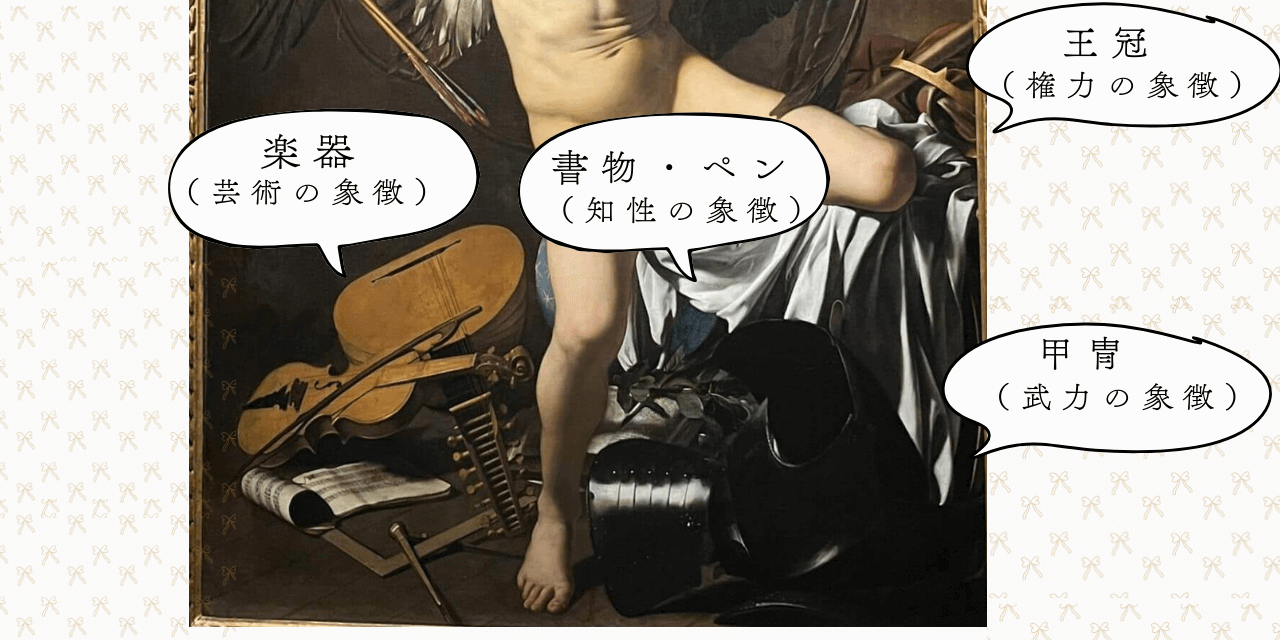 この絵でキューピッド(アモール)が踏みつけているものに注目してください。